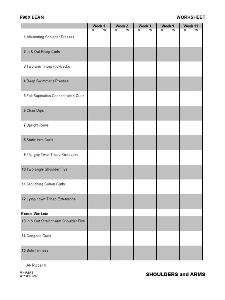 Worksheets are needed for the chest & back, shoulders & arms, legs & back, core synergistics . Worksheet this routine is performed every week that is not a recovery week. Technically, this is a shoulders, biceps, and triceps workout, so the exercises are related to that sequence. 12 ounces of water mixed with 2 scoops of p90x® results and recovery formula®. A worksheet can be prepared for any subject. Insanity / p90x hybrid worksheet/schedule. Select the worksheet for the workout that you are doing. Worksheet • x2 shoulders + arms. The main workout (the exercises in p90x shoulders & arms). A shoulder press (or shoulder fly) . Some of the moves are tough to get all the reps . There are five sets, and you repeat each one twice. R__________________ r__________________ shoulders |arms shoulders arms;